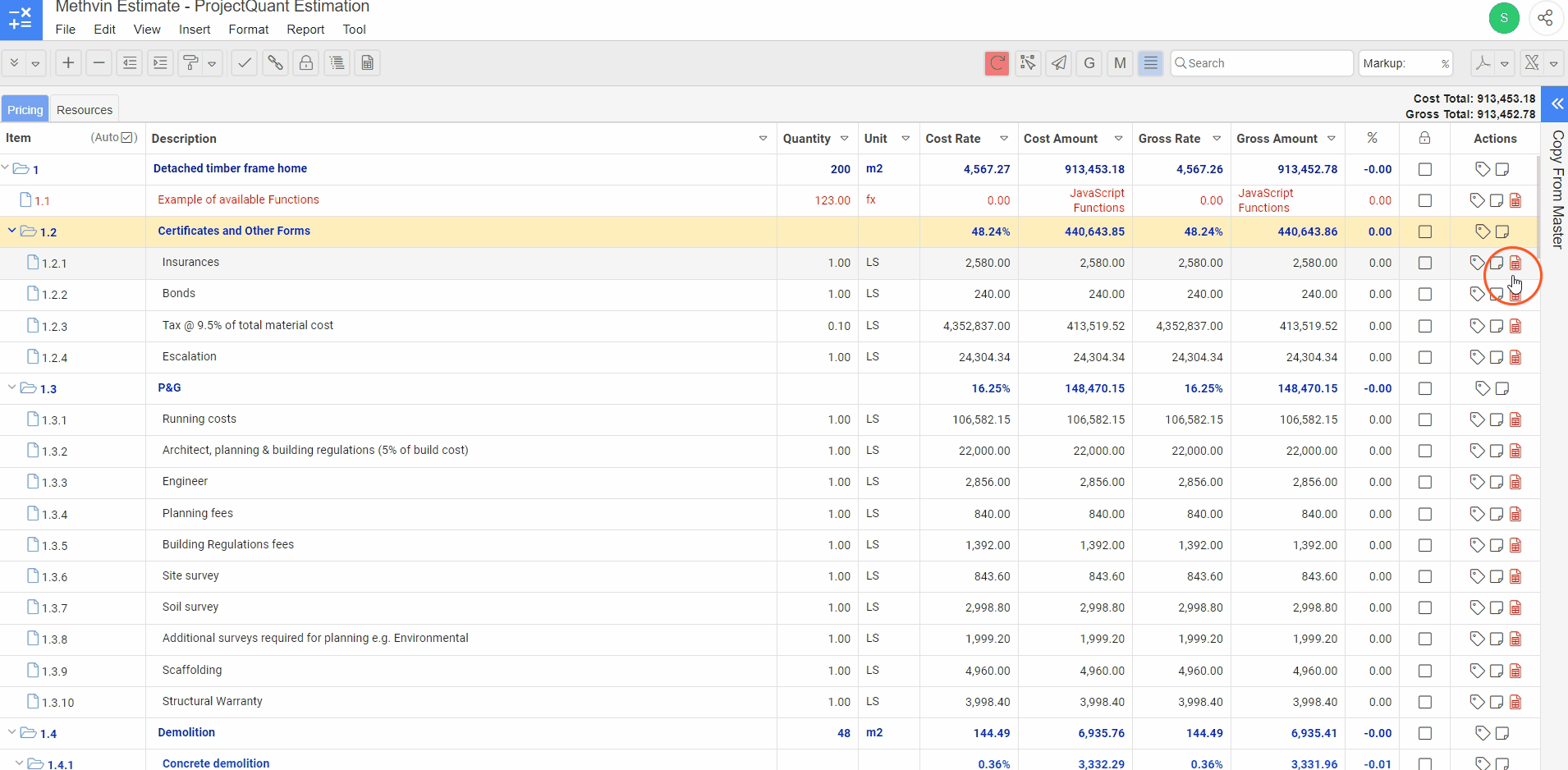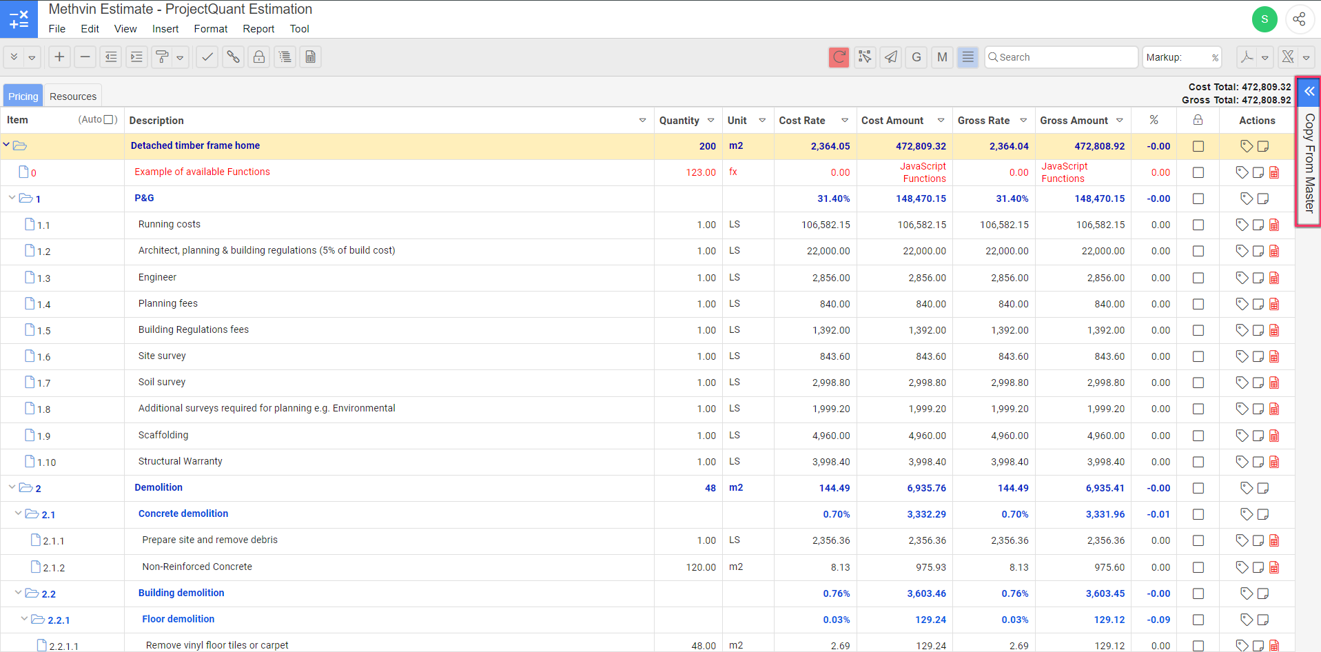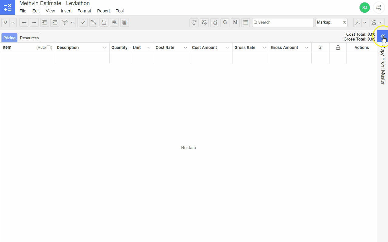 - Access the “Copy from Master” button on the right-hand side of the estimation table.
