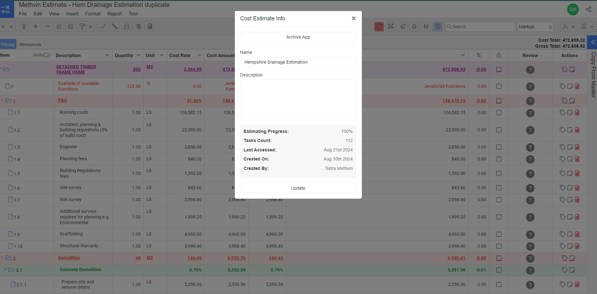 Full Bill Recalculate: Executes a comprehensive recalculation of the entire bill, ensuring all aspects of the project are updated accurately.