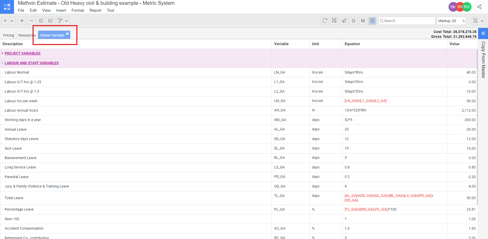 Global Variables: Opens a tab listing global variables with their descriptions, variables, units, equations, and values.