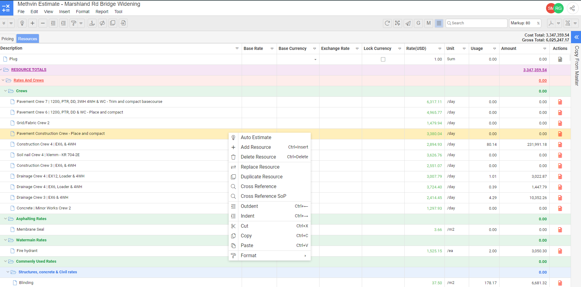 The menu functions in Methvin are context sensitive; therefore, specific tasks can be performed from the context menu of pricing and resources tab.