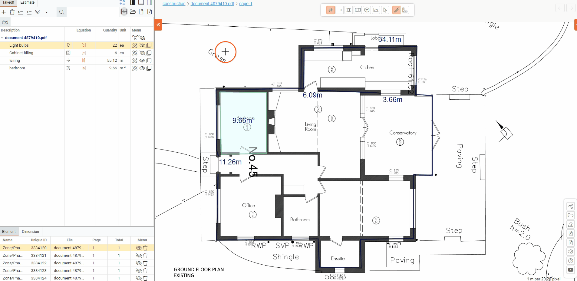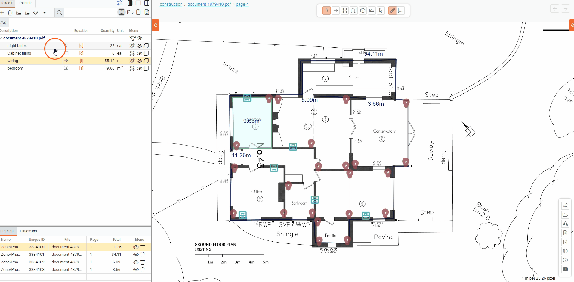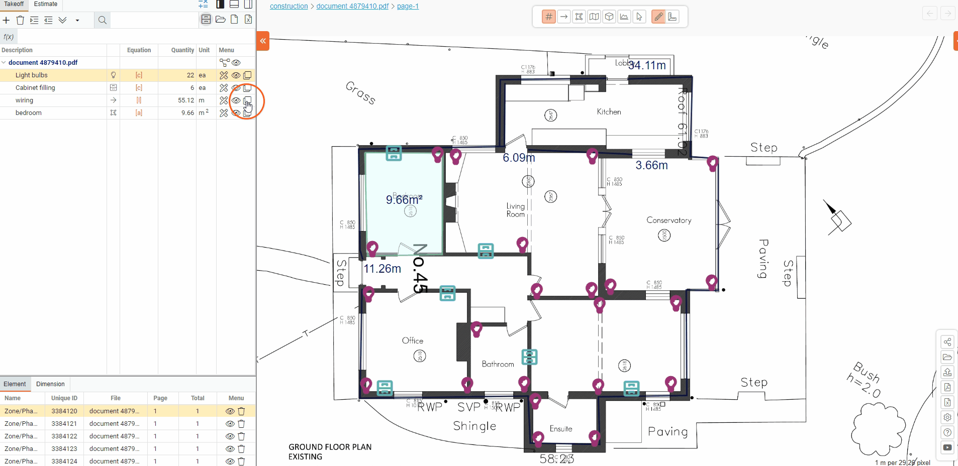 " (Eye) icon next to the measurement. This action will hide all elements of the measurement from the plan. - Verify that the measurement is no longer visible on the plan. The hidden measurement will remain in the bill of quantities table but will be indicated as hidden.
