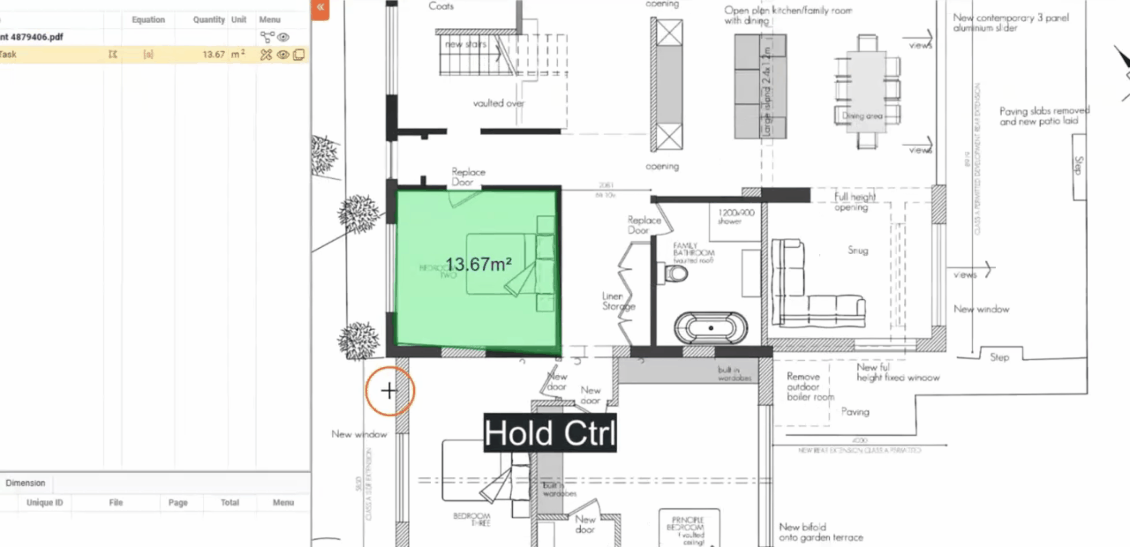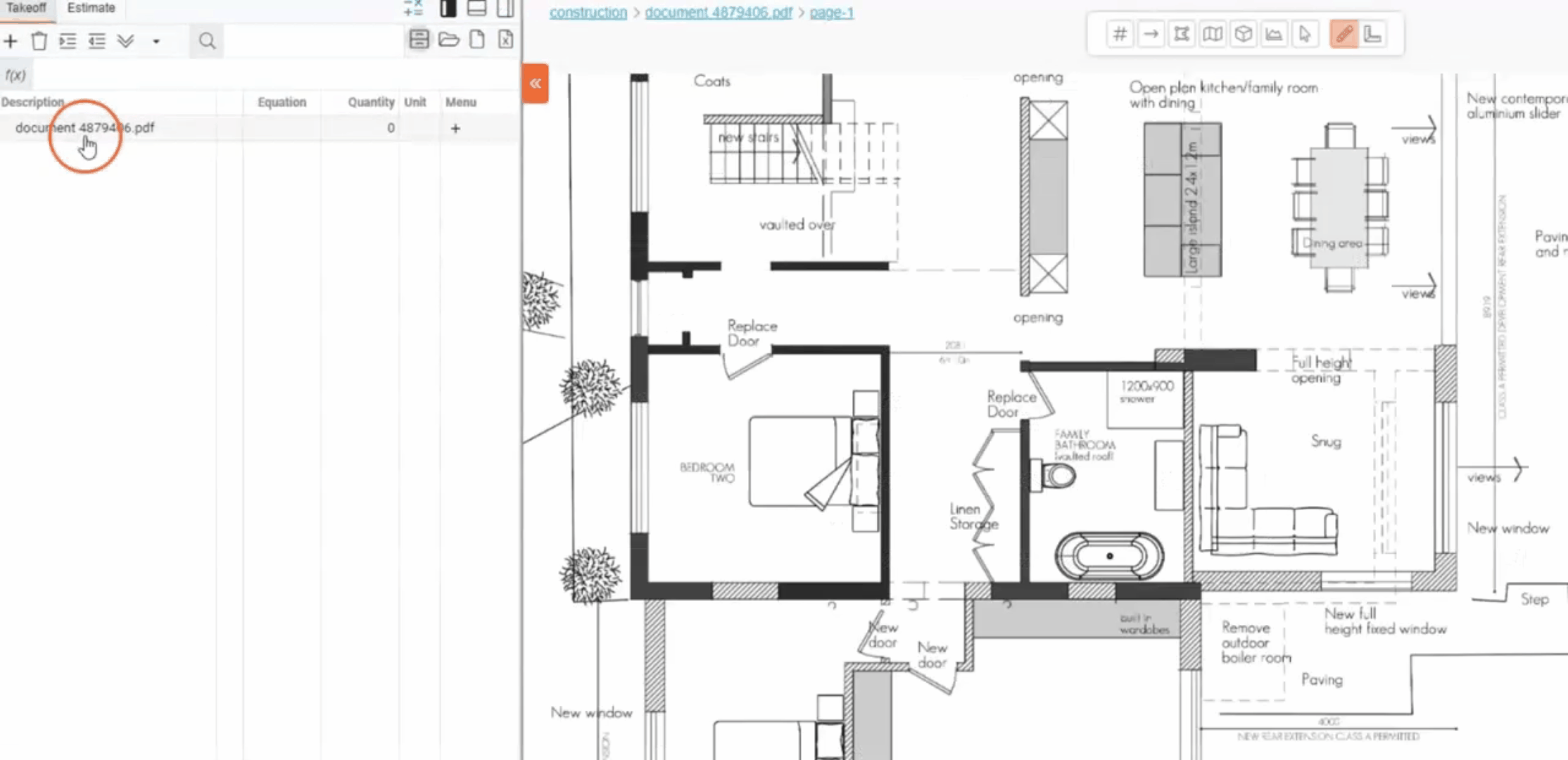 " icon from the bill of quantities table and then clicking to place an Area on the plan.