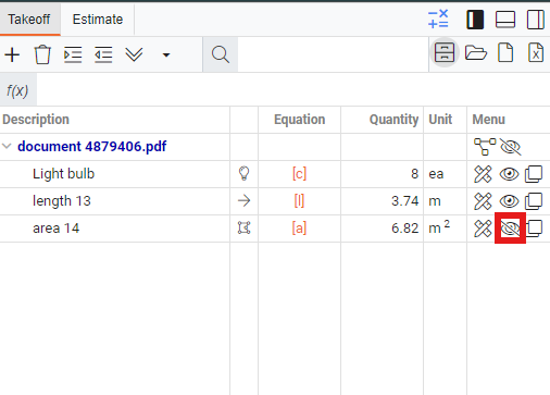 - In the bill of quantities table, click on the ”?” option in the menu column to hide or show the count measure.