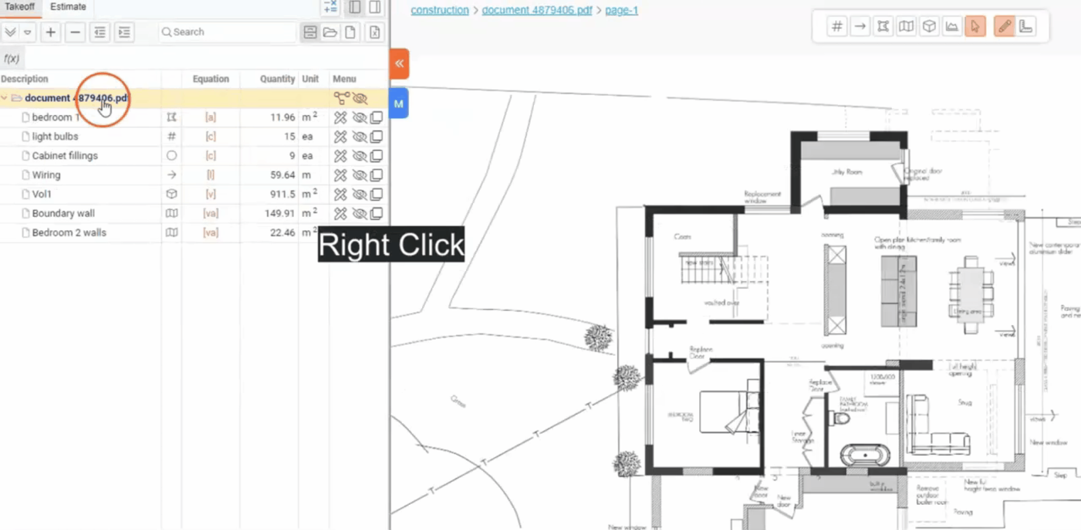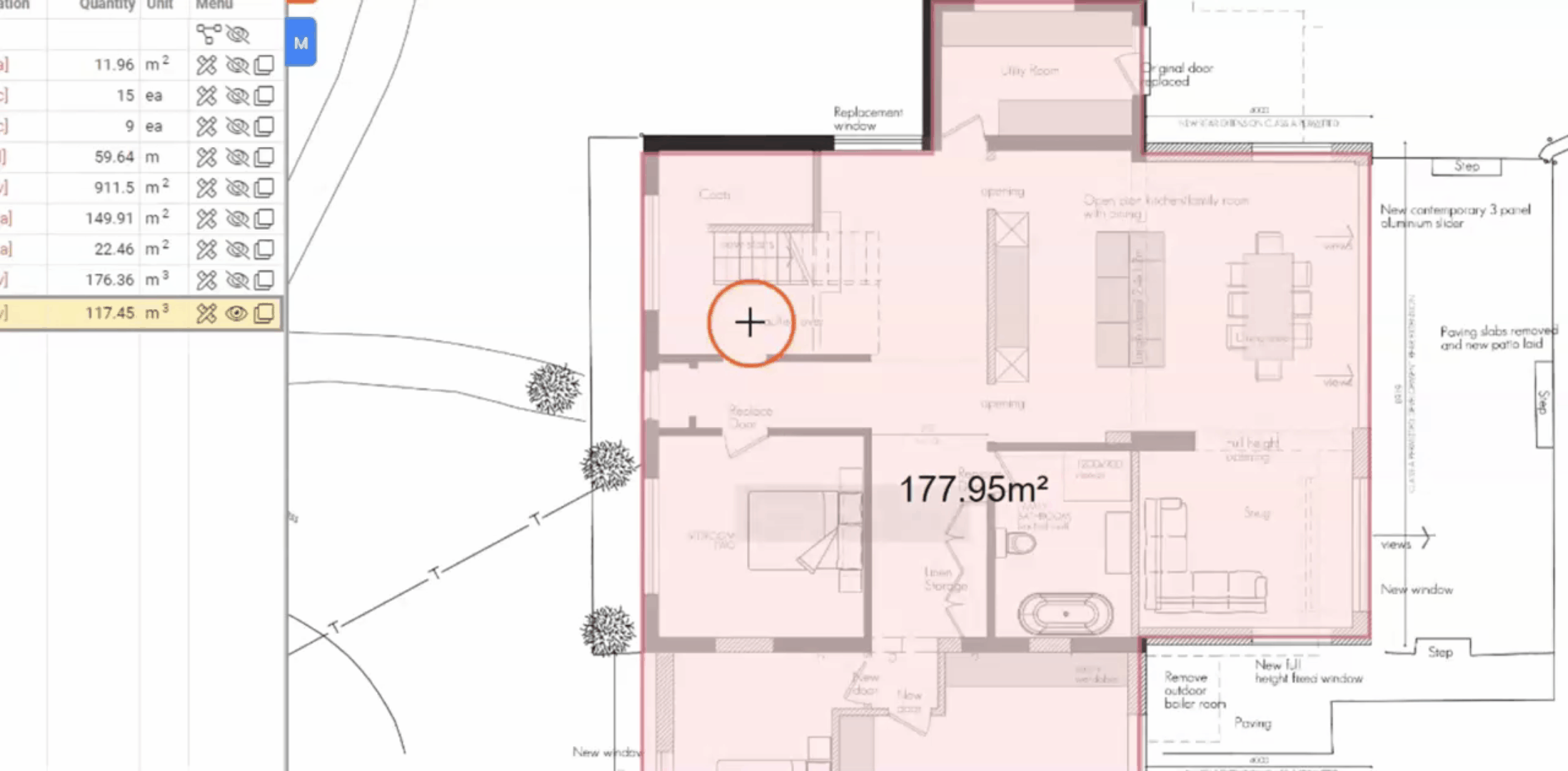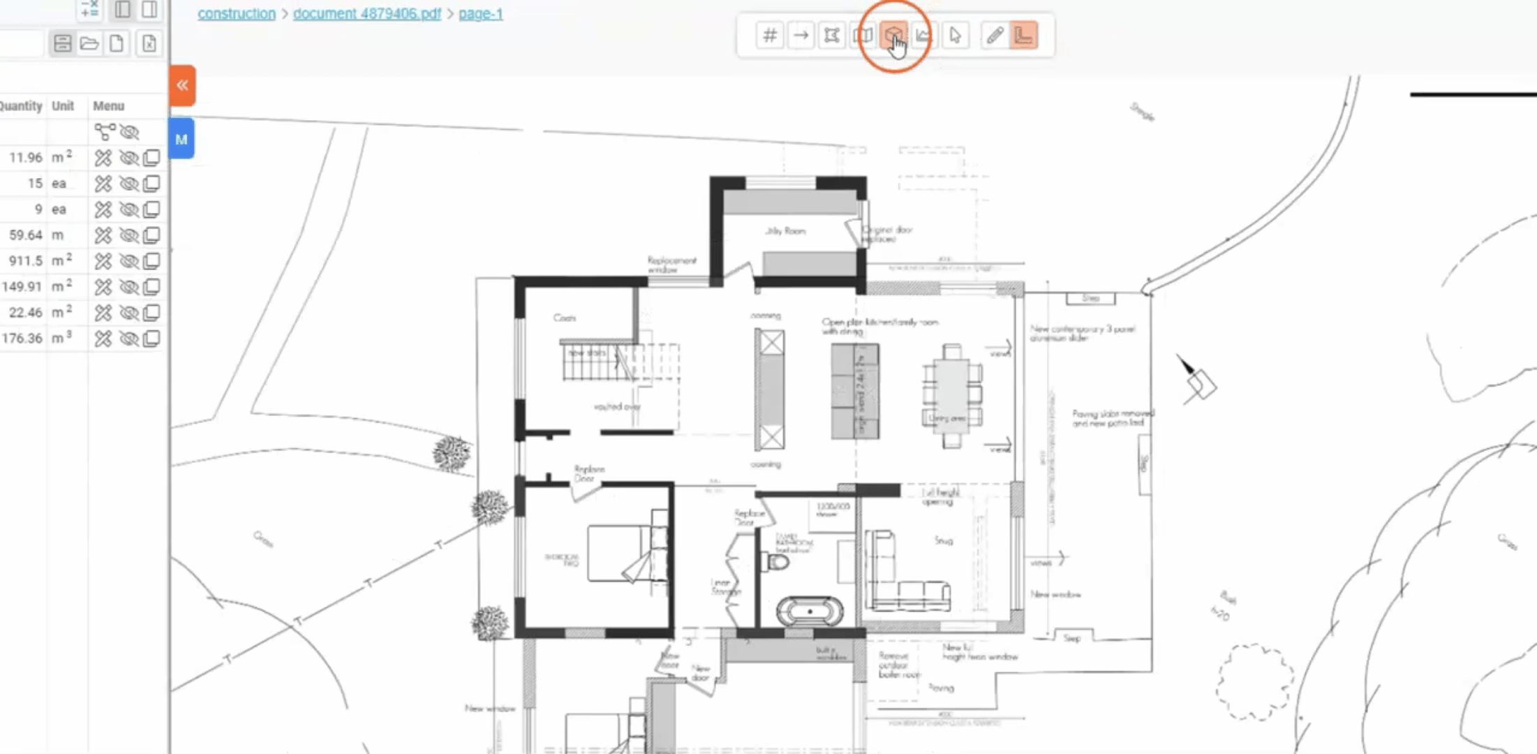 The Volume Measurement Tool allows you to calculate the volume of specific areas on your plans. This tool is essential for accurately estimating materials and resources for projects involving three-dimensional spaces. The tool can be accessed via the quick launch menu or the bill of quantities table.