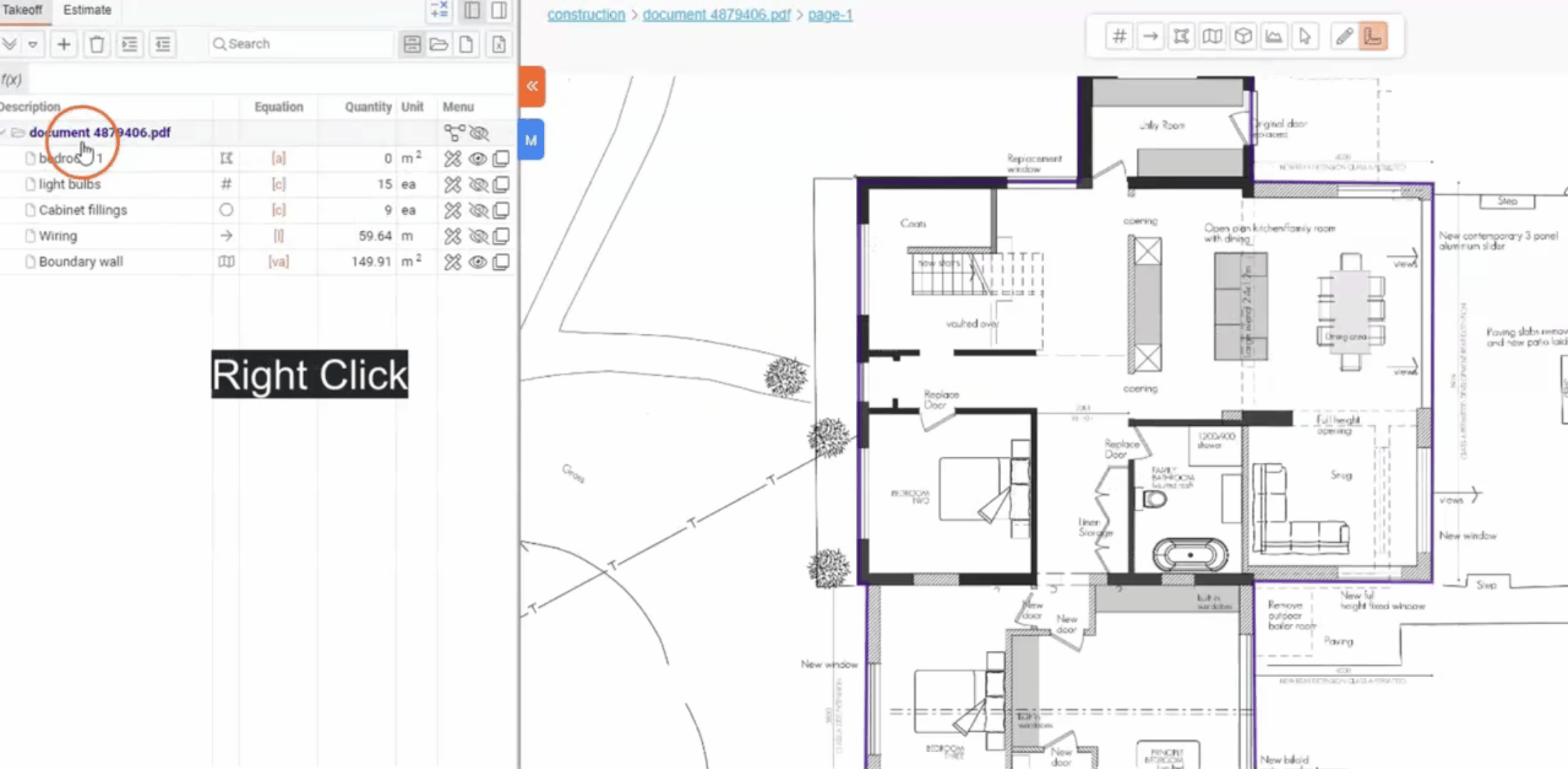 The Wall Area Measurement Tool allows you to accurately measure the vertical area of walls, taking into account their heights. This feature is especially useful in construction and renovation projects where precise wall area calculations are necessary for material estimation and cost planning. This tool is essential for tasks such as estimating materials for wall surfaces, including paint, wallpaper, or cladding. The tool can be accessed via the quick launch menu or the bill of quantities table. Follow these steps to effectively use the Wall Area Measurement Tool.